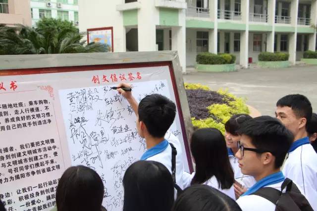 为了积极响应揭阳市创建文明城市,我校倡导同学们自觉做文明学生。并于2016年12月1日在C栋楼下举行了“创文明城市,做文明学生”的倡议活动,本次活动由黄东生副科长主持,为同学们讲解如何做到“讲文明”。主要从三个方面做起: 一、文明在你我话语中。讲文明,懂礼貌,使用文明礼貌用语,自觉使用规范文明网络用语。 二、文明在你我行动中。从日常生活小事入手,养成良好习惯,争做文明学生,争当文明市民,用自己双手创造洁净优美的校园环境。 三、文明在你我的传播中。积极动员父母和亲戚朋友们参与文明城市创建工作,号召同学们携起手来,从现在做起,从点滴做起,努力为揭阳市争创省级文明城市做出自己的贡献。 黄东生副科长表示:做一名文明的学生,要从当下做起,从自身做起,从身边的小事做起。在话语上,尊重他人;在行动上,懂得节约,懂得保护身边的事物;在传播上,渲染和号召他人携手共同做到讲文明。 活动的最后,同学们在创文倡议书中签上自己的名字,表达了对揭阳创文的支持。 通过这次活动,同学们纷纷表示懂得了“文明”做人做事的道理。同时,也培养了他们讲文明的良好习惯,争做文明市民、文明学生,用自己的双手创造洁净优美的校园环境。 文明就在我们身边,让我们一起去行动吧!(撰稿:大专文科1401 庄小珍 王子旭 摄影:大专平面1501 谢钦胜 电子商务1502 杨浩)