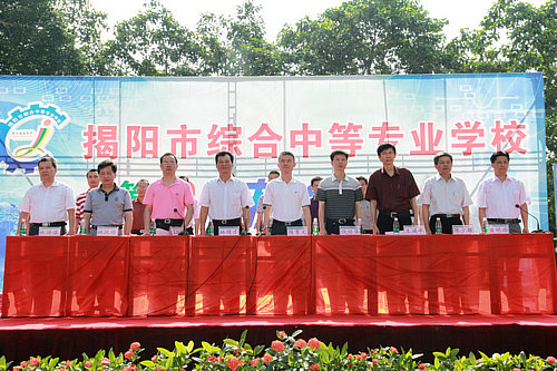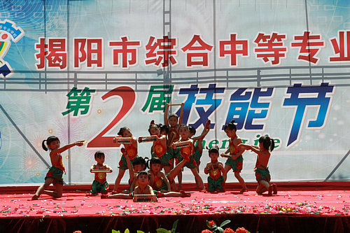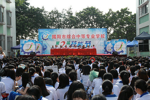 本届技能节学校还邀请了市区几所幼儿园的师生参与专场表演,市教育局陈育文局长、揭阳学院党委林惜才书记、市教育局倪任华副局长、职成科王涌平科长及揭阳学院教务、学生、实训等部门领导出席了开幕式并观看比赛。