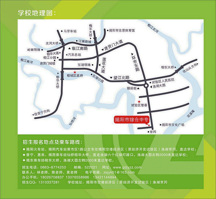 招生电话:0663-8774250 8771891 传真:(0663)8771891 8774250 地址:揭阳市空港经济区空港发展大道南段(渔湖京冈)
