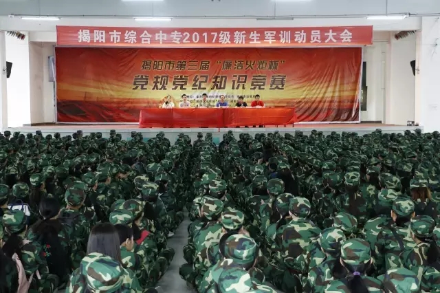 9月4日上午,我校2017级新生军训动员大会在实训楼三楼隆重举行,广东立德国防教育基地训练部林总教官、学校王松亮校长、杨光副校长、学校学生科黄东生科长、谢锐彬副科长、吴晓纯副科长出席大会并在主席台就座,2017级全体新生及班主任参加了大会。会议由学生科黄东生科长主持。 各班同学身着作训服,排列有序,按时到达指定地点。大会在庄严的国歌声中拉开帷幕。林总教官代表军训单位做讲话。并对全体参训教官和同学提出训练要求:要求教官严守群众纪律、遵守学校规定,坚持正规施训,合理组训,提高训练效果;要求同学们在军训中服从命令,听从指挥,令行禁止,刻苦训练,锻炼强健的体魄和顽强的意志,圆满完成军训任务。 学校副校长杨光对全体参训学生作了动员讲话,他首先代表学校,向一贯支持我校军训工作的广东立德培训基地的各位教官表示衷心的感谢! 向17级的全体师生表示热烈的祝贺!杨副校长说,我们学校的学习和生活,将充满艰辛和挑战,同时也会给大家带来极大的快乐,这种快乐往往就产生于你的艰苦努力后所获得的成功。进入中专学校后的第一课就是:完成好军训!军训是学校教育的一种特殊形式,是其他教育过程所不可替代的。接着杨副校长向同学们提出了几点要求:一、要充分认识军训和入学教育的意义,增强军训的自觉性;二、克服骄气,端正态度,力争上好第一课;三、遵纪守法,团结互助;四、尊重教官、尊敬老师、服从命令、听从指挥。 揭阳市综合中等专业学校2017级新生军训现在开始”随着王松亮校长一声令下,林总教官立即指挥调整队形并命令教官代表为参训学生进行军训动作示范表演,“跑步走!”伴随着铿锵有力的口号,整齐划一的步调,承训教官们示范了本次军训的所有科目,赢得了阵阵热烈的掌即日起,2017级全体新生将开始以饱满的热情和昂扬的斗志,体验难忘的军训生活。声。(撰稿:王子旭 摄影:现代教育1601 方乙耿 大专会计1601 黄杨洙、王涵 审核:黄东生)