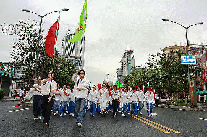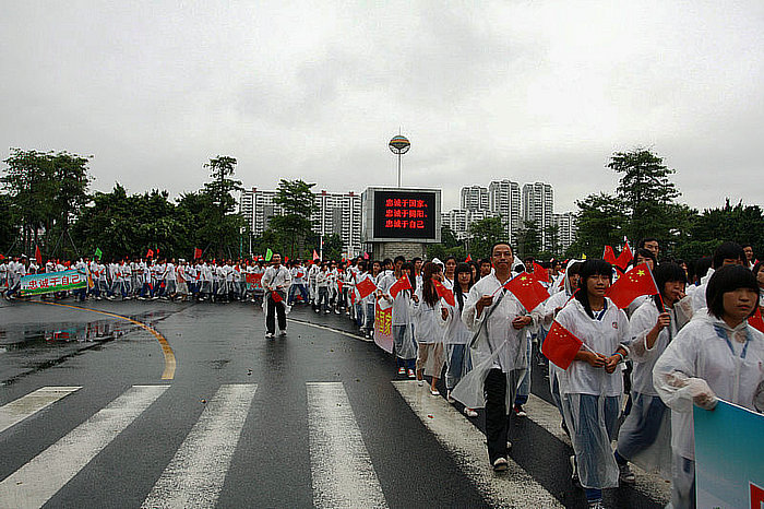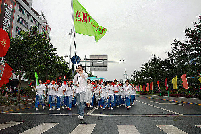 我校组织学生参加市“忠诚•感恩万人行”活动 9月21日下午,我校组织四百多名师生参加了市委市政府组织的“忠诚•感恩万人行”活动。该活动旨在深入贯彻落实省委十届七次全会和市委四届七次全会精神,以塑造“忠诚如山,感恩奉献”精神为目标,教育引导全市人民忠诚于国家、忠诚于揭阳、忠诚于自己,进一步增强广大干部群众践行忠诚、感恩奉献的自觉性和主动性,为推动揭阳经济社会跨越发展,建设富民强市、和谐文明新揭阳提供强大的思想动力。 我校高度重视此次活动,按照市委活动方案要求,认真组织四百多名师生,按规定规定时间到市政府大门口集中。学校王松亮校长亲自带头参加活动,师生们服饰整洁,队列齐整,精神抖擞,高举“忠诚于国家”、“忠诚于揭阳”、“忠诚于自己”的标语牌,一路挥舞手中的红旗,齐声高呼 “忠诚如山,感恩奉献”口号,昂首阔步,用实际行动践行忠诚,向全市人民展示了我校师生的风采。