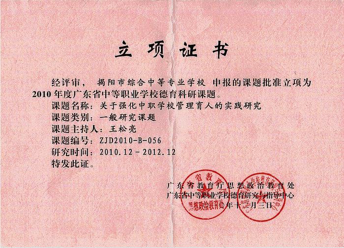 当前位置:主页->信息中心->学生科->通知公告->我校省级德育科研课题《关于强化中职学校管理育人的对策研究》获批准