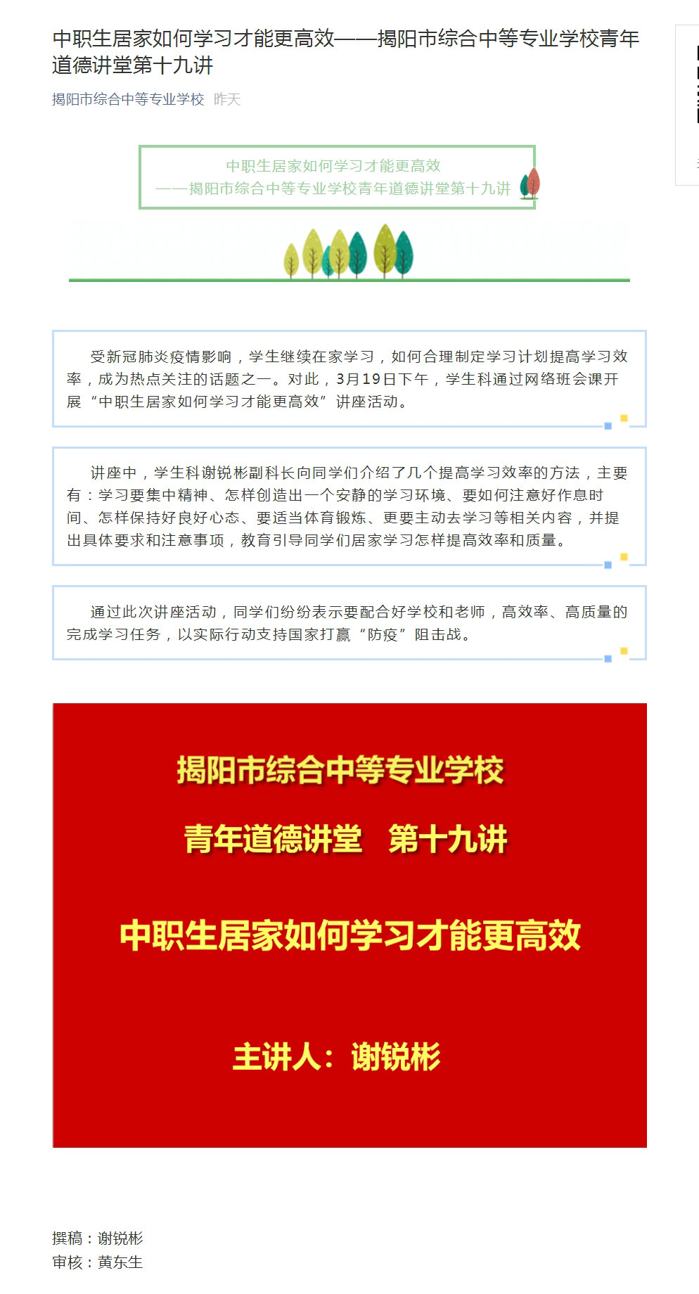 中职生居家如何学习才能更高效——揭阳市综合中等专业学校青年道德讲堂第十九讲