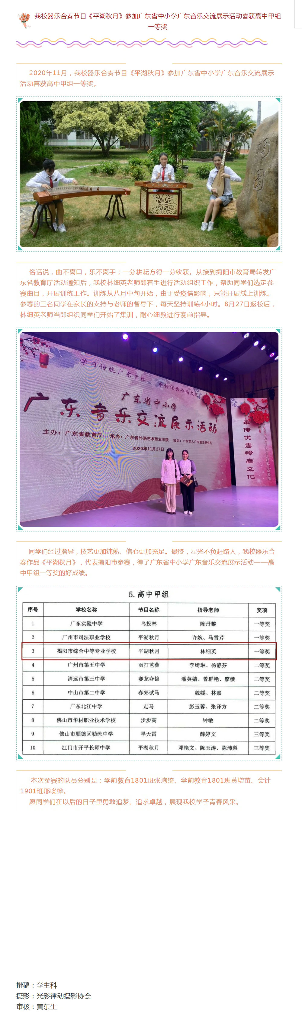 我校器乐合奏节目《平湖秋月》参加广东省中小学广东音乐交流展示活动喜获高中甲组一等奖