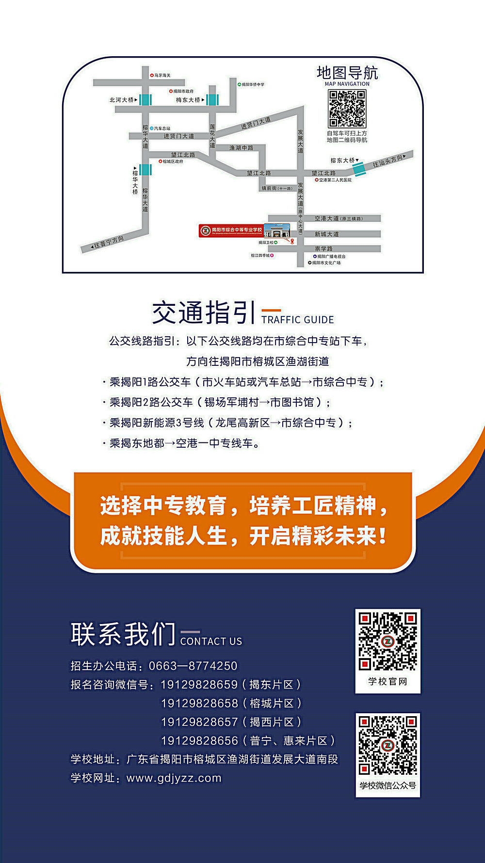 招生电话:0663-8774250 8771891 传真:(0663)8771891 8774250 地址:揭阳市空港经济区空港发展大道南段(渔湖京冈)