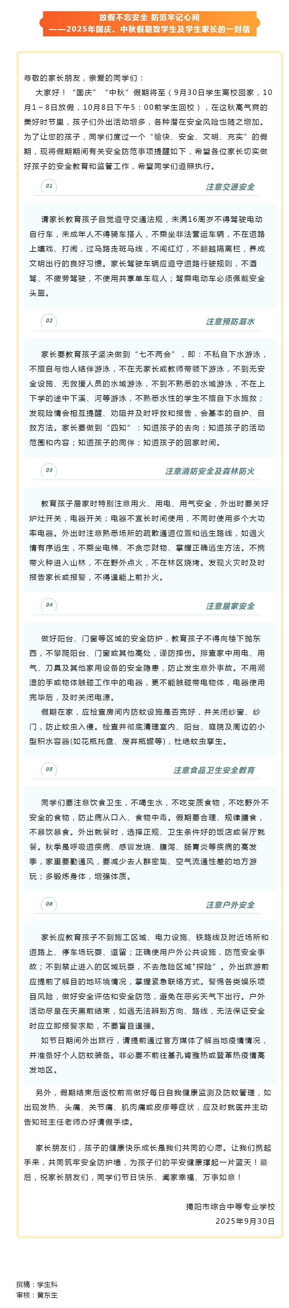 放假不忘安全 防范牢记心间——2025年国庆、中秋假期致学生及学生家长的一封信