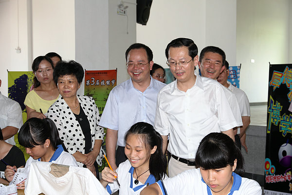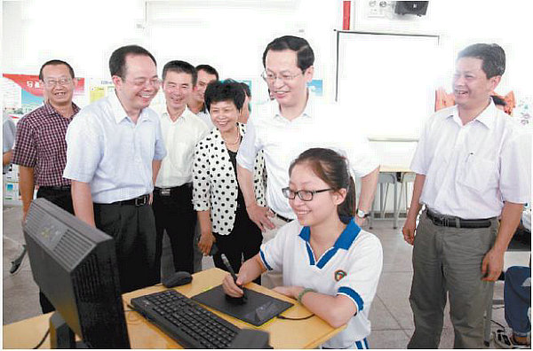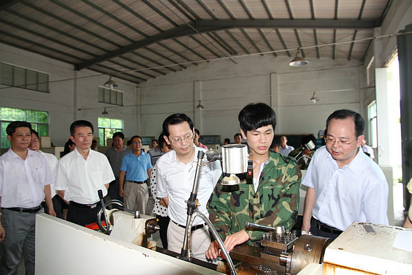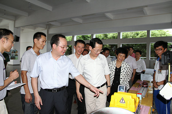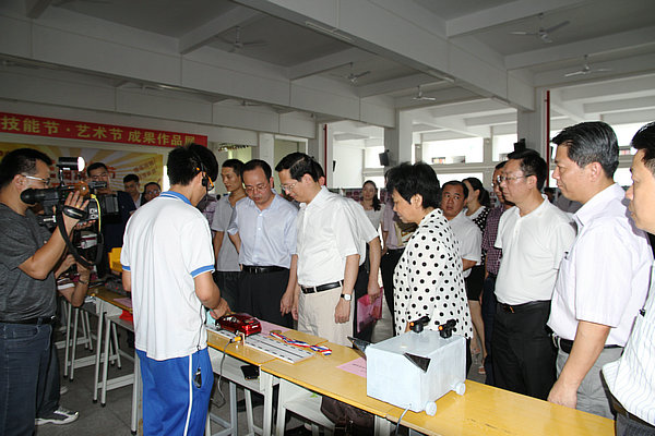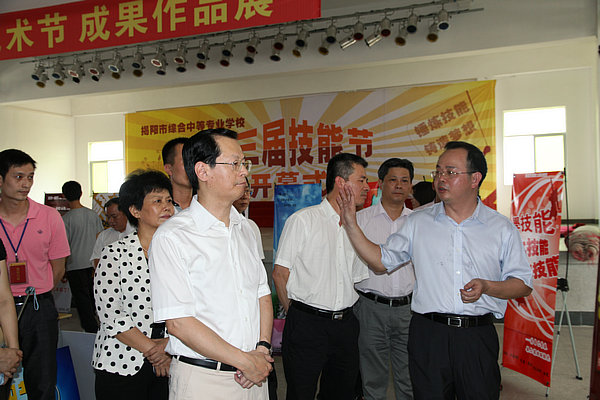 6月18日下午,市委书记、市人大常委会主任陈绿平在副市长林丽娇,市教育局陈育文局长陪同下到我校调研指导工作。陈书记首先参观学校第三届技能节成果展和第十届校园文化艺术节图片展。由我校学生发明的智能红绿灯提示系统,荣获第28届广东省青少年科技创新大赛“一等奖”,陈书记观看演示后,充分肯定学生的创新意识创新能力。在手绘板绘画区、电子商务演示区、广告设计和数控作品展示区、校园艺术节图片展示区,每到之处,陈书记都认真询问,专心听取讲解,对我校既注重专业技能培训,又注重学生综合素质培养的做法表示肯定和赞赏。在航空服务专业学生风采展区,陈书记认真询问专业发展情况,当得知航空服务专业已经有100多位学生在潮汕机场及省内各大机场服务其中有两位学生已正式成为南航空姐时,陈书记十分高兴,要求我校要把航空服务专业办出特色,办出水平,为揭阳空港海港经济培养更多高素质服务人才。