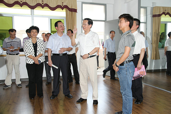 在学校新落成实训楼6楼艺术实训基地,陈书记走进舞蹈实训室,和正在指导学生排练舞蹈节目的周彬老师亲切交谈,湖南籍老师周彬毕业于河南郑州大学舞蹈专业,去年初陈书记亲自带队到华南师范大学招聘老师,她在聆听陈书记推介揭阳发展状况时,被陈书记求贤若渴的真诚所感动,欣然应聘到我校任教,陈书记关切询问她的工作和生活情况,勉励她要扎根揭阳,为培养更多优秀人才作出积极贡献。在音乐教室,陈书记看望正在排演合唱节目的学生,鼓励学生珍惜学校优良的学习环境,努力学习专业技能,陈书记同时强调高素质的师资队伍,是培养高素质人才的重要前提。学校在加强管理的同时,要引进更多高水平教育人才,进一步提升办学质量。陈书记还考察了学校实训基地数控、汽车实训车间,兴致勃勃地观看学生实操比赛。在听取王松亮校长做学校规划发展情况汇报后,陈书记充分肯定学校在专业设置和人才培养等方面取得的成绩,强调一定要突出专业特色,加强与揭阳发展方向和产业发展方面的对接,打造特色品牌,走出一条精细发展的路子。