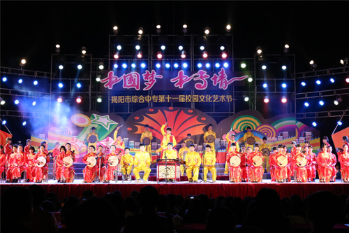 当晚8时,晚会在一曲气势磅礴的潮州大锣鼓《鼓鸣盛世》中拉开序幕。接着,欢快的舞蹈、幽默的三句半、美妙的歌声、经典的潮剧选段、精彩的武术表演、激情昂扬的诗朗诵、饱含感情的合唱等一一登台亮相,高潮迭起。师生们满怀豪情,现场气氛十分热烈,校园里一片欢歌笑语,大家都沉浸在美的文化艺术享受中。在约一个半小时的时间里,市综合中专的师生们用自编自演的节目尽情展示多才多艺的风采,展现了校园文化生活的五彩缤纷、蓬勃向上,体现了广大师生锐意进取的精神风貌、满怀奋进的豪情。在晚会接近尾声之际,陈绿平等市领导走上舞台,同演出的师生深情合唱《歌唱祖国》。