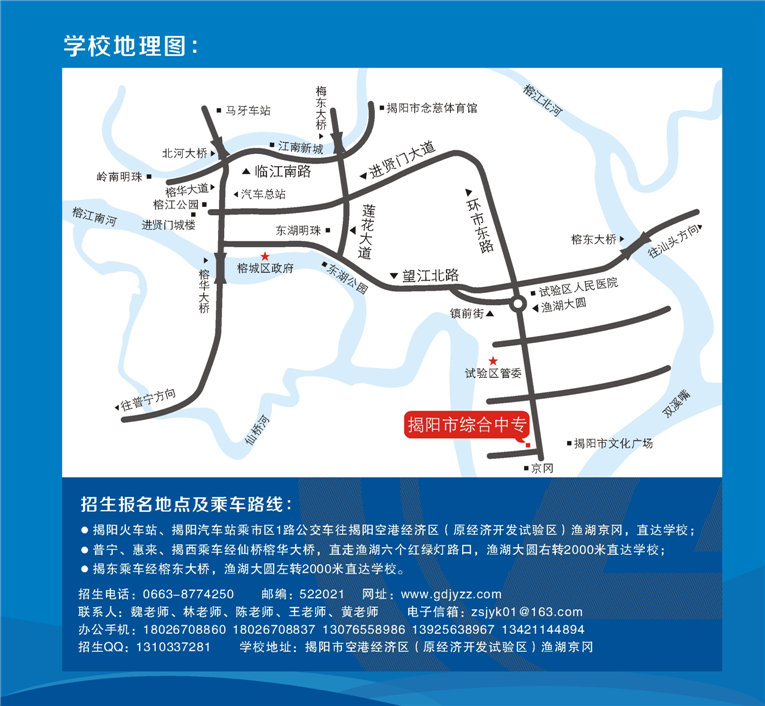 招生电话:0663-8774250 8771891 传真:(0663)8771891 8774250 地址:揭阳市空港经济区空港发展大道南段(渔湖京冈)