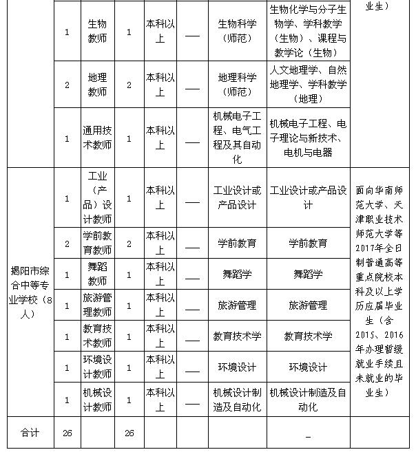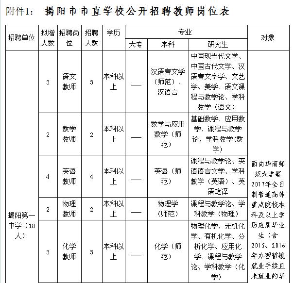 为满足市直学校教学工作的需要,揭阳市人力资源和社会保障局、揭阳市教育局定于2016年12月17日至21日到华南师范大学面向2017年普通高等重点院校全日制应届毕业生招聘市直学校教师26名,现将有关事项公告如下: