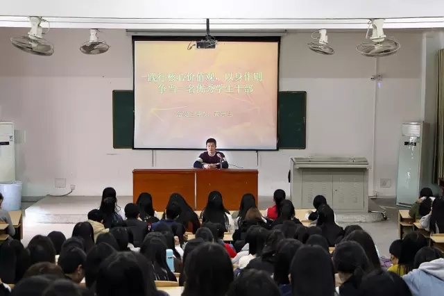 2017年3月6日下午,学生科在教学楼C栋104多媒体教室举行了主题为“践行核心价值观,以身作则,争当一名优秀的学生干部”的会议。会议由学生科负责人黄东生主持,参加本次会议的有学校团委会与学生会全体干部、各社团负责人、各班班长和团支书。