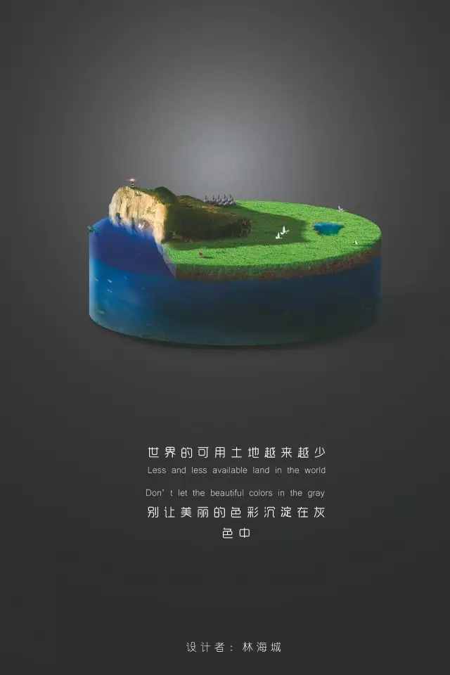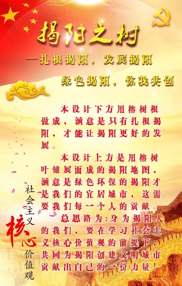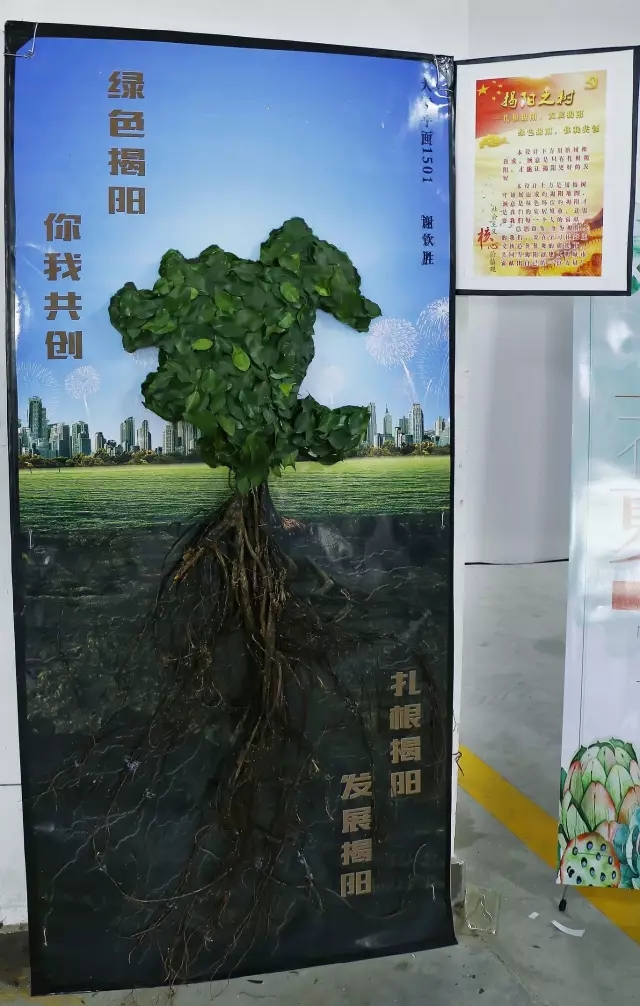 一等奖作品:揭阳之树(用切割后准备抛弃的榕树根与树叶结合背景设计而成的立体公益广告设计)