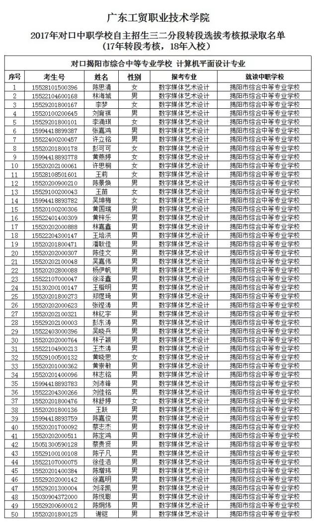 根据《广东工贸职业技术学院2017年三二分段自主招生转段考核实施方案》的精神,现将拟录取名单公示如下。最终录取结果以广东省教育考试院审核通过的名单为准:
