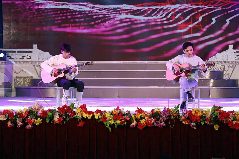 在学校吉他协会带来青春,励志的开场曲《我相信》、《理想三旬》之中,唱出了他们对音乐的热爱,对梦想的追逐,天籁般的歌声,带领着大家触摸灵动的乐符。现场气氛迅速升温,扬起了全场观众的热情。