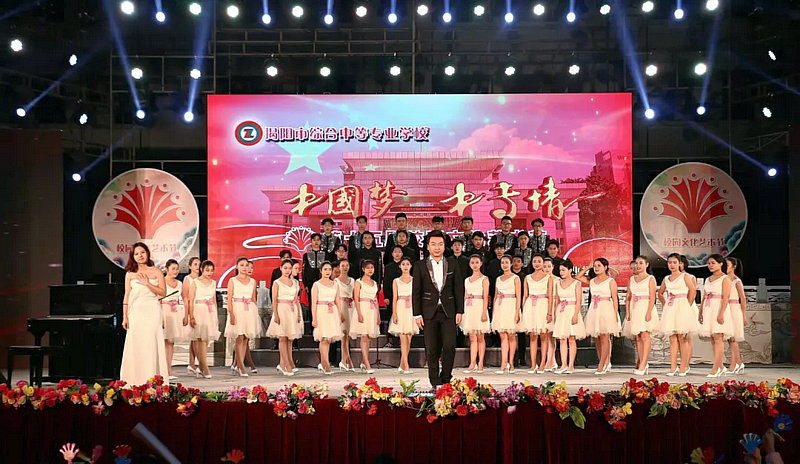 中国梦,梦牵家国,继往开来兴伟业;中专情,情系职教,厚德游艺谱华章。