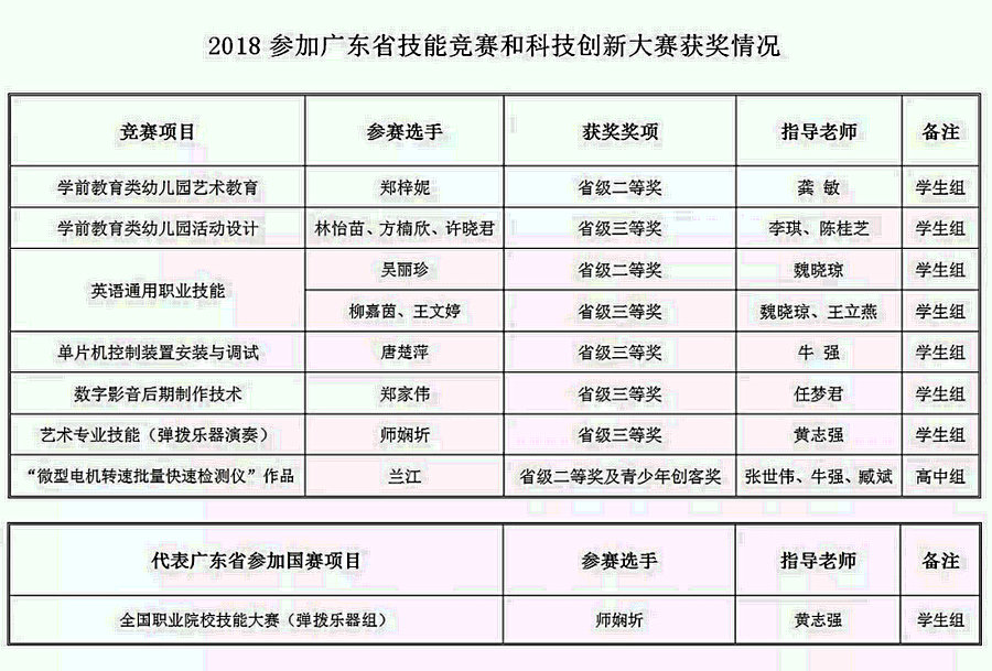 据统计,我校在今年的省赛中共获得三个二等奖、五个三等奖的佳绩,位列粤东地区同类职业学校前列,尤其是在2017—2018年度广东省职业院校技能大赛艺术专业技能(弹拨乐器演奏)中,我校师娴圻同学凭借本身良好的综合素质能力,在比赛中荣获综合排名第八,被选为广东省出战国赛代表,在这里为师娴圻同学表示祝贺!但在选才、指导队伍、备赛、赛场表现等诸多环节还存在亟待提高的地方,需要广大技能教师潜心研究,力争在今后的大赛中取得进步。