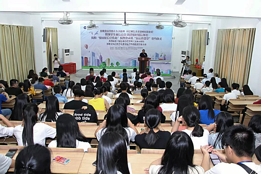 随后,建设银行揭阳市分行高级金融讲师李剑锋老师为同学们带来了有奖征信知识讲座,同学们认真听讲、涌跃答题,热闹精彩纷呈。