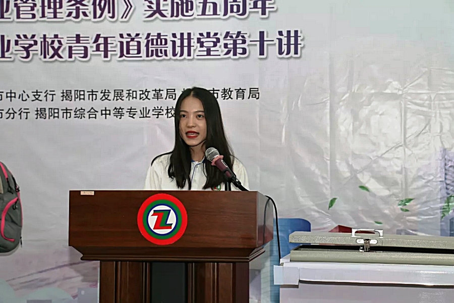 征信宣传站站长方淑秒同学发言,她代表揭阳市综合中等专业学校校园“征信宣传站”所有学生干部表态,在任职期间,将努力学习、积极参与“校园征信宣传站”活动,配合学校与银行开展学生征信宣传工作,为我校的诚信文化建设贡献出自已的一份力量。