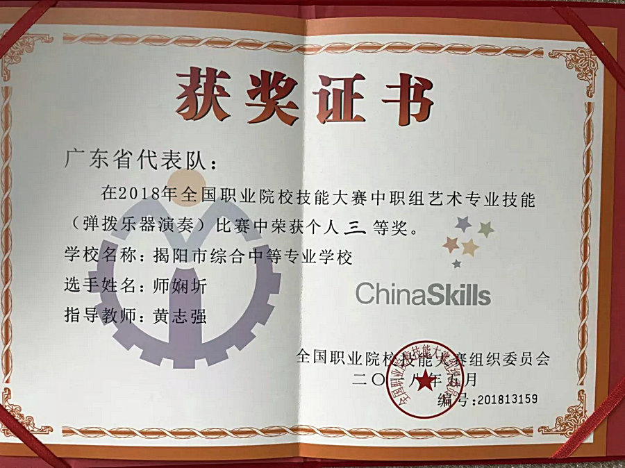 6月19日至22日,一场汇聚了各类民乐弹拨乐器,由各艺术院校青春学子弹奏演绎的国家级音乐盛会——2018年全国职业院校技能大赛中(高)职组“艺术专业技能(弹拨乐器)赛项”在浙江艺术职业学院开赛。我校学子师娴圻代表广东省代表队参加了此次大赛,面对来自全国各省市区126位选手,其中不乏中央音乐学院附中、中国音乐学院附中、上海音乐学院附中的弹奏高手。但师娴圻不怯场、不放弃,奋勇拼搏,最终在强手如云的总决赛中脱颖而出,一曲《幻想曲》宛转悠扬,清脆悦耳。以充分的准备和完美的发挥获得三等奖的佳绩,为广东省代表队赢得了荣誉。