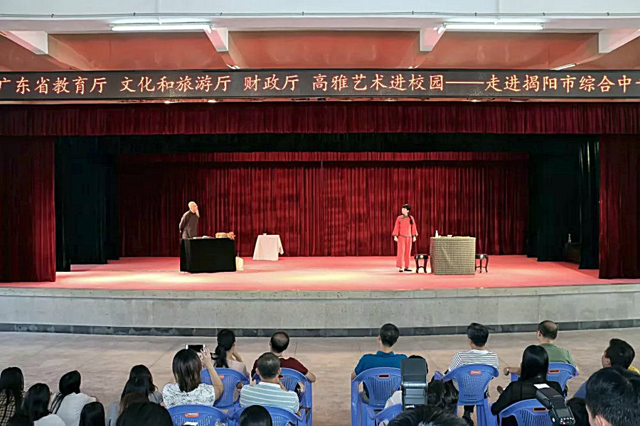 为营造健康向上的校园文化氛围,陶冶学生艺术情操,增强人文修养,10月17日下午,我校在实训楼三楼大厅举行2019年高雅艺术进校园活动,邀请广州话剧艺术中心走进校园为师生带来戏剧选段展演。教育局体卫艺科科长刘初晓、揭阳市音乐家协会主席卢泽纯、学校副校长黄明浩、教务科科长黄少波、实训中心主任魏继革、学生科副科长吴晓纯、艺术中心与艺术组全体教师观看了演出。