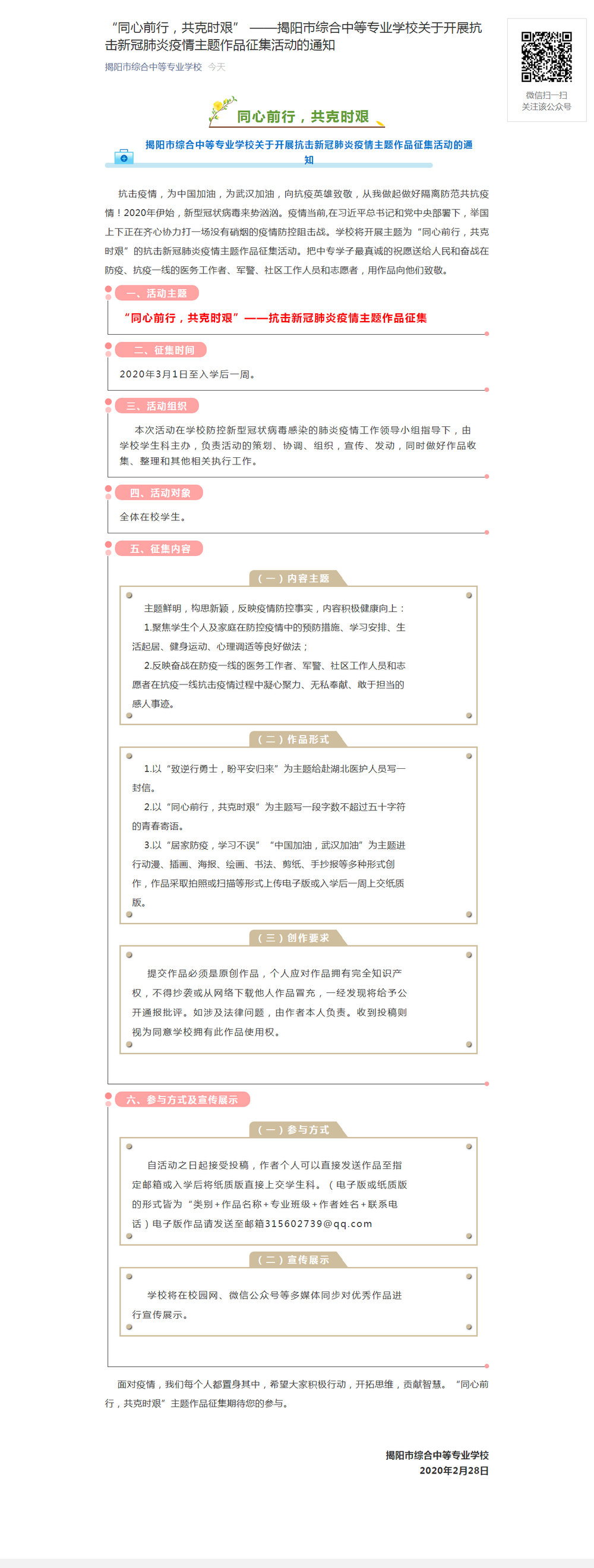 “同心前行,共克时艰” ——揭阳市综合中等专业学校关于开展抗击新冠肺炎疫情主题作品征集活动的通知