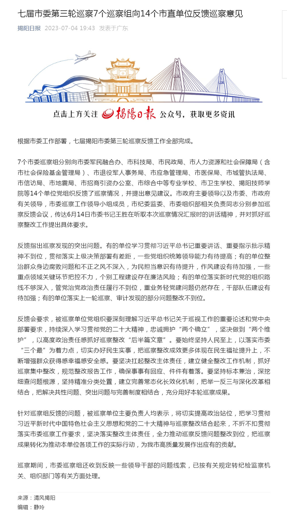 七届市委第三轮巡察7个巡察组向14个市直单位反馈巡察意见